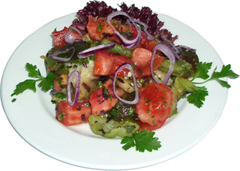 Салат овощной Картофель и морковь отварить и нарезать кубиками. Салат и отваренную цветную капусту нашинковать. Помидоры, огурцы, яблоки нарезать ломтиками. Молодой горошек отварить. Подготовленные овощи смешать и заправить солью, лимонной кислотой, рубленой зеленью, сметаной.Картофель - 40 г, морковь - 20 г, салат - 10 г, цветная капуста - 20 г, помидоры - 50 г, огурцы - 30 г, яблоки - 20 г, горошек - 10 г, соль, лимонная кислота, сметана - 40 г, яйцо - 1/2 шт., зелень - 5 г. Подавать к столу, украсив яйцами и зеленью. |
