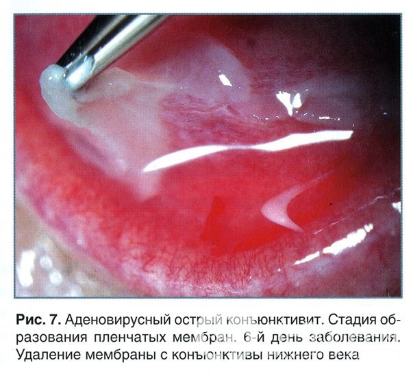 Для просмотра нажмите на ссылку. Аденовирусный конъюнктивит у детей в 25% случаев представлен пленчатой формой. Для заболевания характерно появление на конъюнктиве тонких нежных пленок серовато-белого цвета. В большинстве случаев их легко можно удалить ватным тампоном, но иногда они принимают вид плотных фиброзных отложений, спаянных со слизистой оболочкой. В этом случае они удаляются с трудом, после удаления участки конъюнктивы под ними кровоточат. У некоторых пациентов образуются инфильтраты и кровоизлияния в подъконъюнктивальном пространстве. После выздоровления они полностью рассасываются. При пленчатом аденовирусном конъюнктивите у детей и у большинства взрослых страдает общее состояние: повышается температура тела до 38,5–39,5 °С, появляется общее недомогание, слабость, головная боль. Продолжительность лихорадочного периода составляет от 3 до 10 дней.