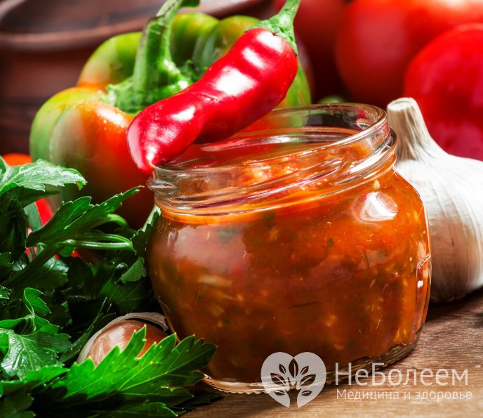 Аджика является низкокалорийной приправой, которая может употребляться в составе диетического питания совместно с овощными блюдами и рыбой.