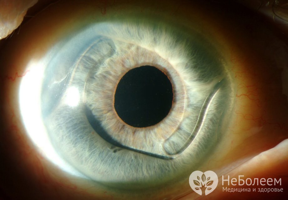 Передняя камера пораженного глаза глубокая. При движении глазного яблока заметно дрожание радужной оболочки (иридодонез). На роговице заметен рубец, оставшийся после перенесенного хирургического вмешательства.