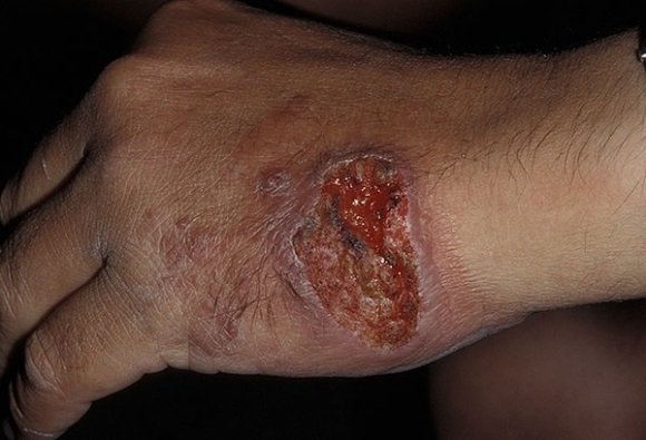 Основной симптомом кожного амебиаза – малоболезненные язвы с подрытыми неровными краями, обладающие неприятным запахом. Чаще всего язвы образуются на коже промежности, половых органов, а также в области послеоперационных ран и свищей.