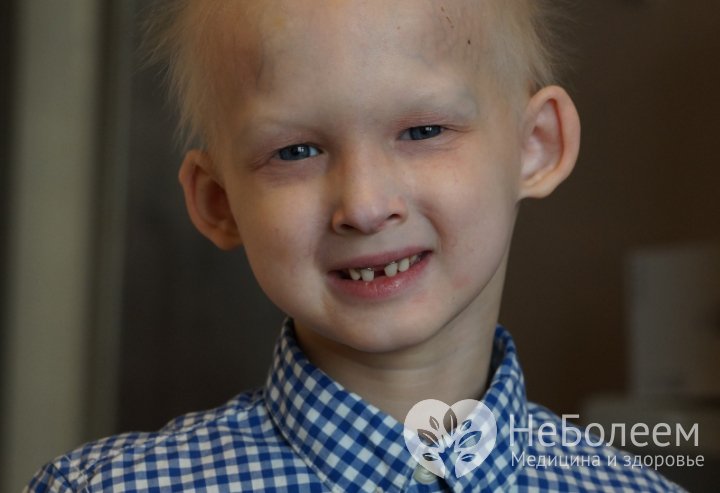 волосы редкие, тонкие, пушкового вида, растут медленно, слабо пигментированы, брови и ресницы короткие, редкие либо полностью отсутствуют;